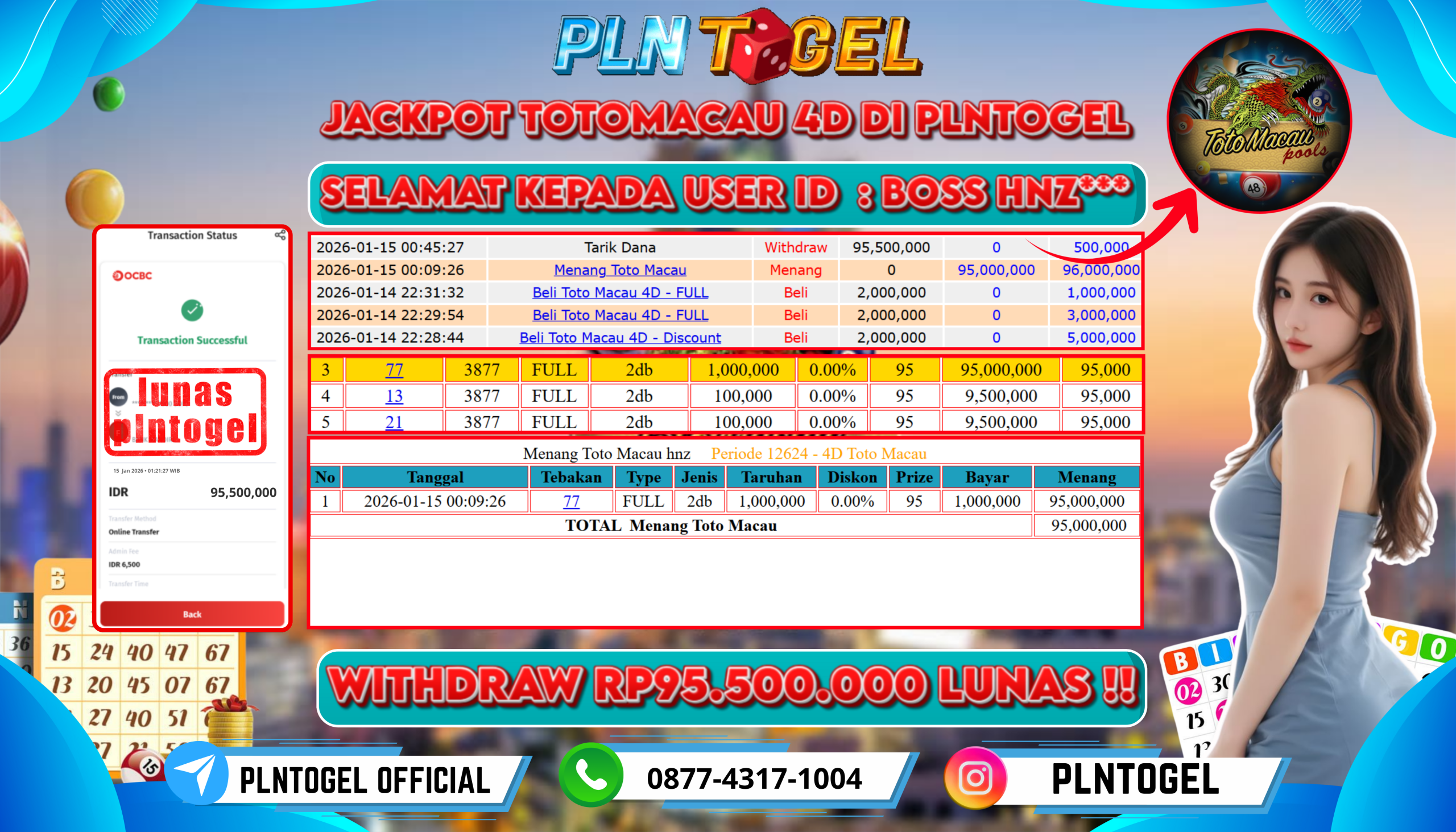BUKTI JACKPOT TOGEL ONLINE 15 Januari 2026 Posted by plntogel TOTO MACAU 4D KAMIS, 15 JANUARI 2026 RP 95,500,000,- SELAMAT KEPADA PEMENANG, SALAM JP Updated: 15 Januari 2026 at 04:45 ◀ BUKTI JACKPOT SLOT GAME PREDIKSI SYDNEY LOTTO ▶